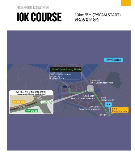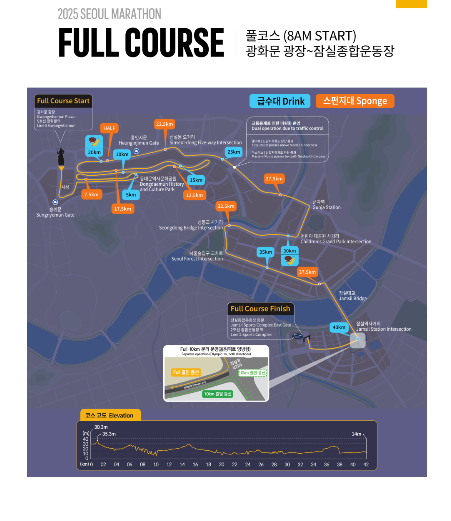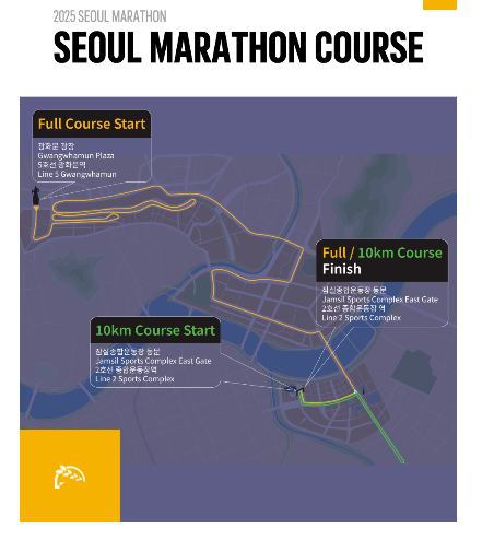 마라톤 코스는 서울 광화문광장 출발~잠실종합운동장 도착 풀코스입니다.